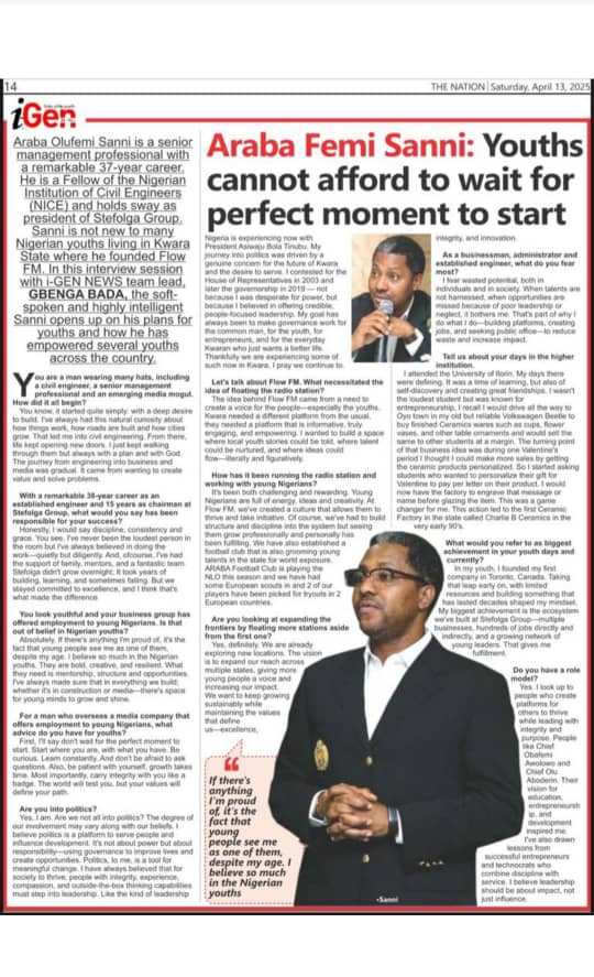 Sanni’s journey began with a passion for civil engineering, driven by a desire to build and solve problems. Over his 37-year career, he has transitioned into business and media, creating platforms for young Nigerians to grow. Flow FM, which he founded, serves as a voice for the youth, providing a space for local stories and talent to flourish.